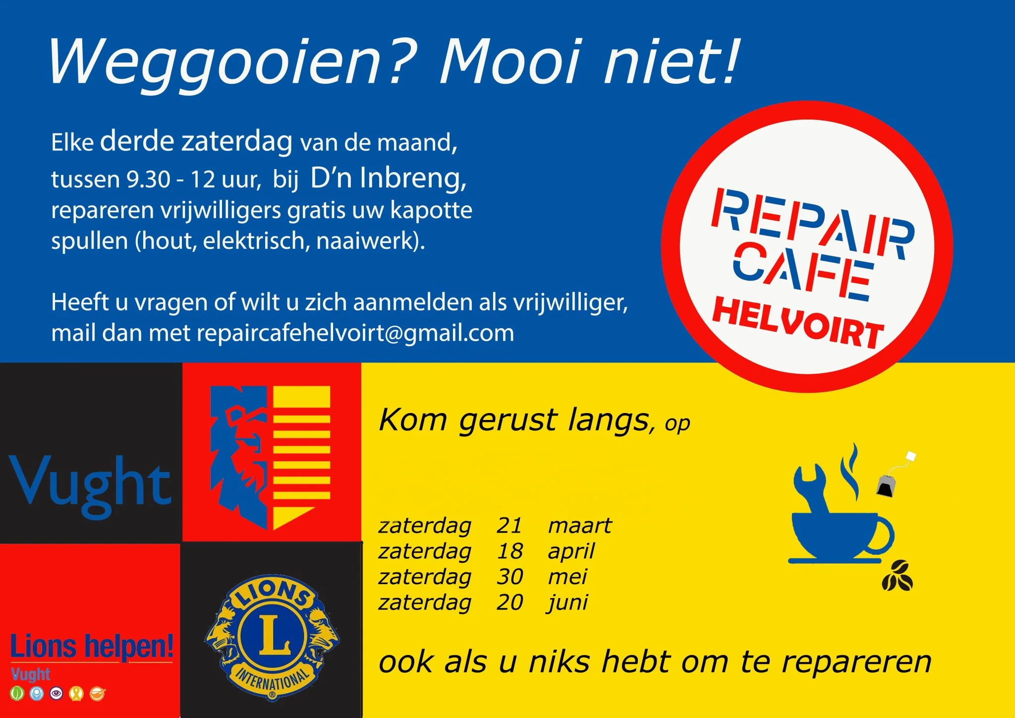 « Alle Evenementen Dit evenement is voorbij. Repair Café Helvoirt 21 maart 2026 om 09:30 - 12:00 « Film “The Reader” Taizéviering » Meer info KLIK HIER Toevoegen aan kalender Google Calendar iCalendar Outlook 365 Outlook Live Gegevens Datum: 21 maart 2026 Tijd: 09:30 - 12:00 Locatie Jeugdhuis d’n Inbreng van beringenstraat 2b Helvoirt, Noord Brabant 5268 AM Nederland + Google Maps Bekijk de site van Locatie